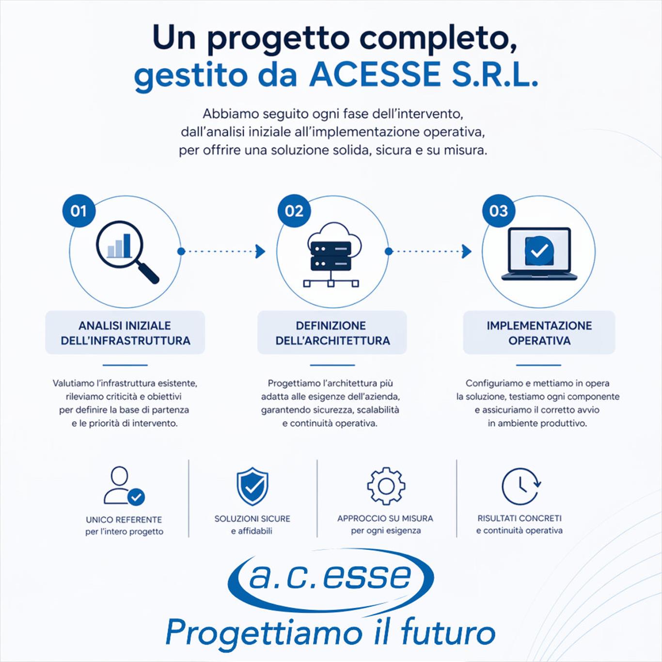 Il progetto è stato interamente progettato e realizzato da acesse s.r.l, che ha curato tutte le fasi dell’intervento: dall’analisi iniziale dell’infrastruttura alla definizione dell’architettura, fino all’implementazione operativa.