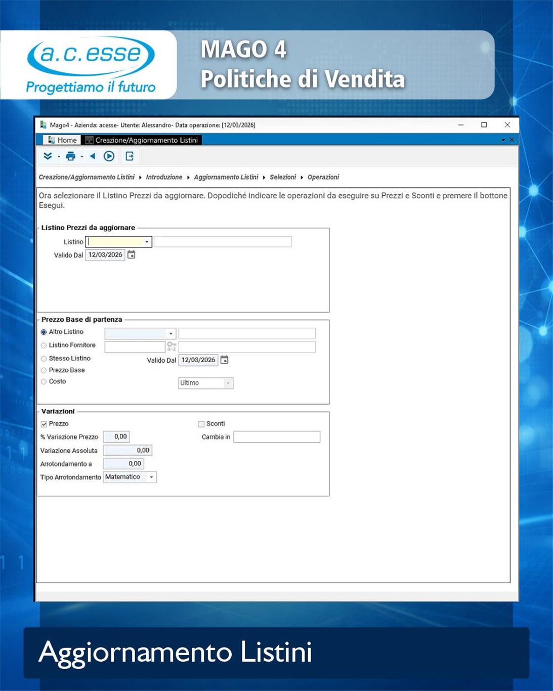 La procedura di aggiornamento consente di selezionare il listino da modificare e di applicare le operazioni desiderate sui valori già presenti. Anche in questo caso è possibile definire il prezzo base di partenza, impostare variazioni e criteri di arrotondamento, mantenendo così un processo coerente e tracciabile.