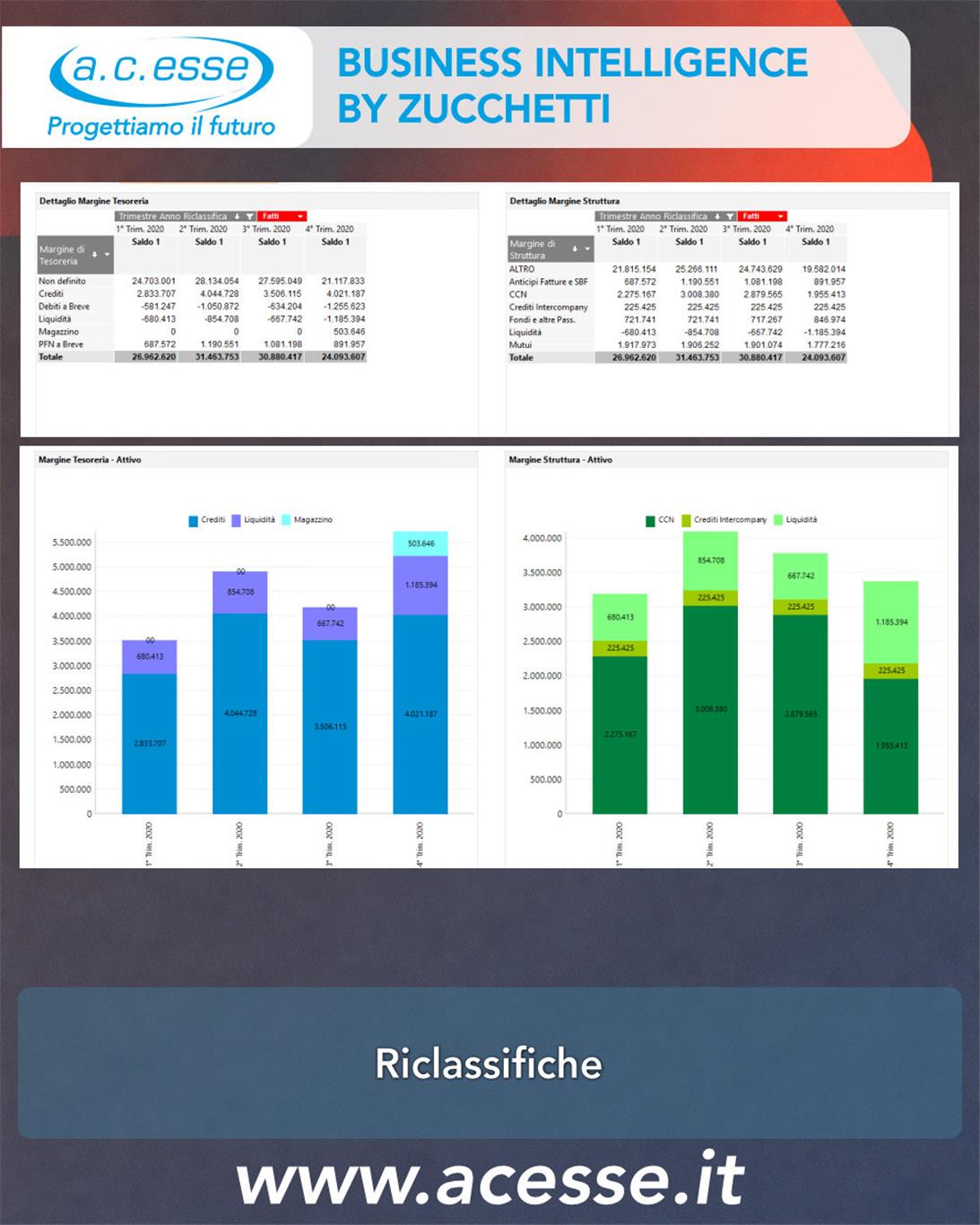 Margini Tesoreria e Struttura: Pivot per dettagli trimestrali; barre per composizione Attivo/Passivo.